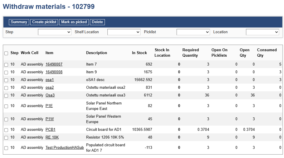 Valitse nimike tai nimikkeet ja paina "Merkitse kerätyksi"-painiketta. Tämä kerää nimikkeet samalla tavalla kuin nimike-välilehti työerällä Huomioi ettet voi tehdä tätä eräseurattaville nimikkeille.